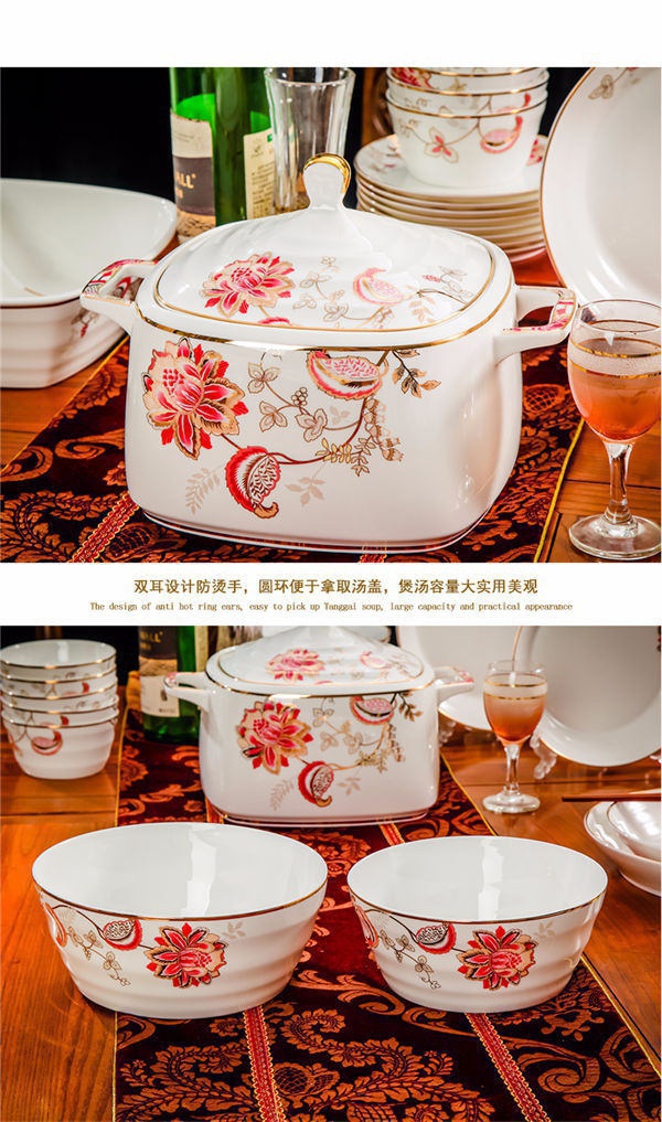 65頭醉花吟,一個湯煲,一個魚盤,一個大飯勺,一個大湯碗,一個牙簽筒,六個面碗,四個三寸碟,十個盤子,十個4.5寸飯碗,十個五寸骨碟,十個調(diào)羹,十個筷子架。