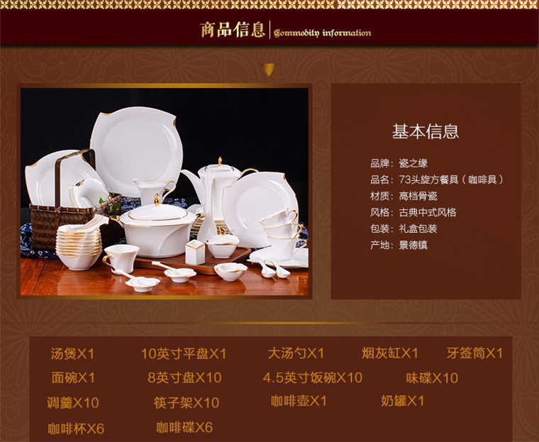 73頭旋方帶咖啡具,餐具一個(gè)湯煲,一個(gè)魚(yú)盤(pán),一個(gè)十寸平盤(pán),一個(gè)大湯勺,一個(gè)煙缸,一個(gè)牙簽筒,兩個(gè)面碗,十個(gè)八寸盤(pán),十個(gè)4.5寸飯碗,十個(gè)味碟,十個(gè)調(diào)羹,十個(gè)筷子架。咖啡具一個(gè)咖啡壺,一個(gè)糖缸,一個(gè)奶罐,六個(gè)杯子,六個(gè)碟子。
