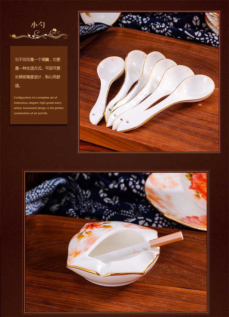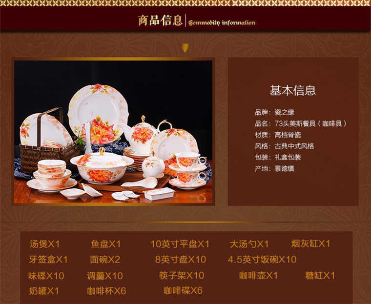 73頭美斯帶咖啡具,餐具一個(gè)湯煲,一個(gè)魚(yú)盤(pán),一個(gè)十寸平盤(pán),一個(gè)大湯勺,一個(gè)煙缸,一個(gè)牙簽筒,兩個(gè)面碗,十個(gè)八寸盤(pán),十個(gè)4.5寸飯碗,十個(gè)味碟,十個(gè)調(diào)羹,十個(gè)筷子架??Х染咭粋€(gè)咖啡壺,一個(gè)糖缸,一個(gè)奶罐,六個(gè)杯子,六個(gè)碟子。